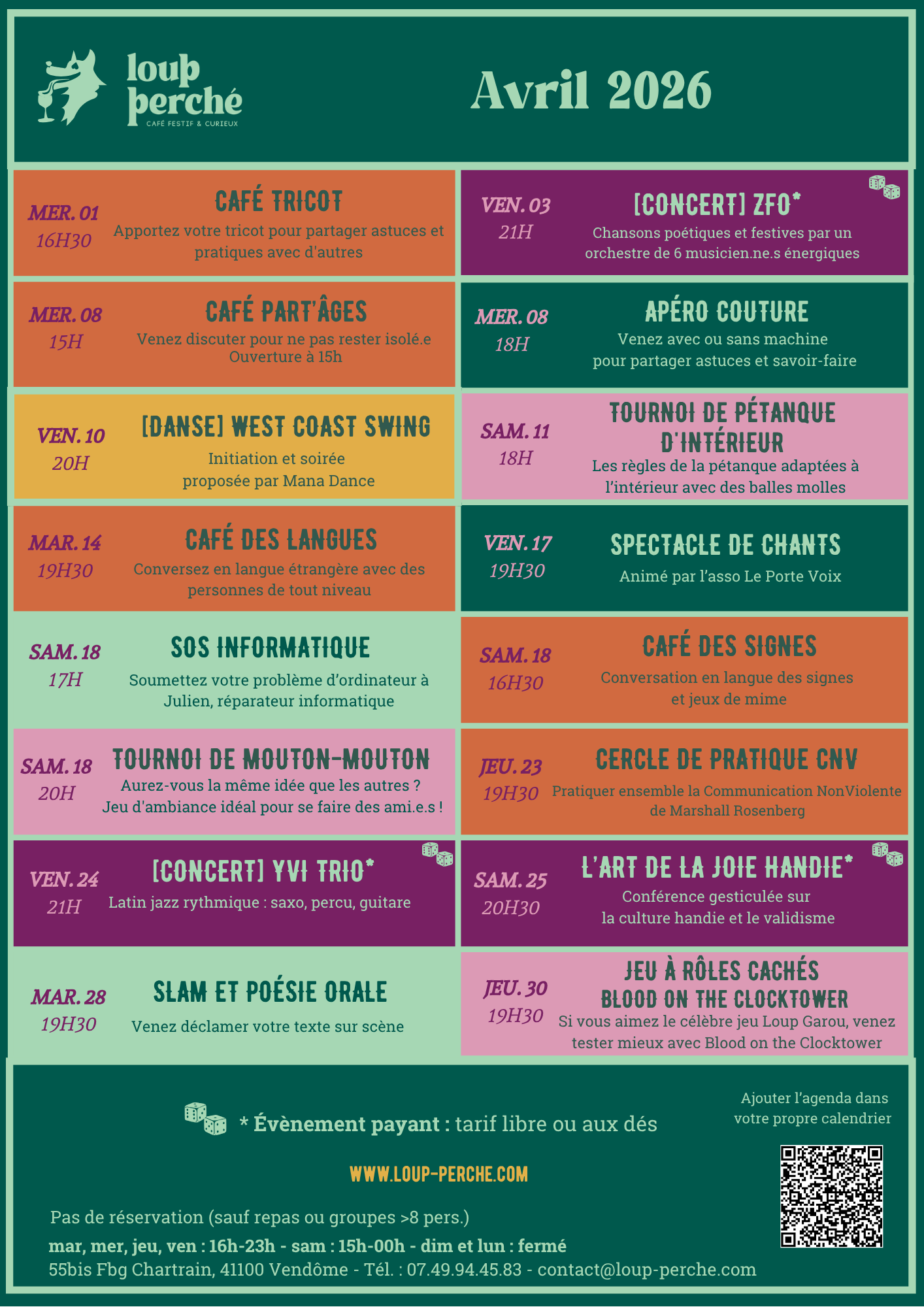 Lors de certains évènements pour lesquels nous engageons des frais supplémentaires non couverts par la vente des boissons (rémunérations des artistes et animateurs, SACEM, repas, achat ou location de matériel…) le tarif est libre (vous décidez du montant de votre contribution) ou aux dés (vous laissez le lancer de dés décider du montant pour vous)