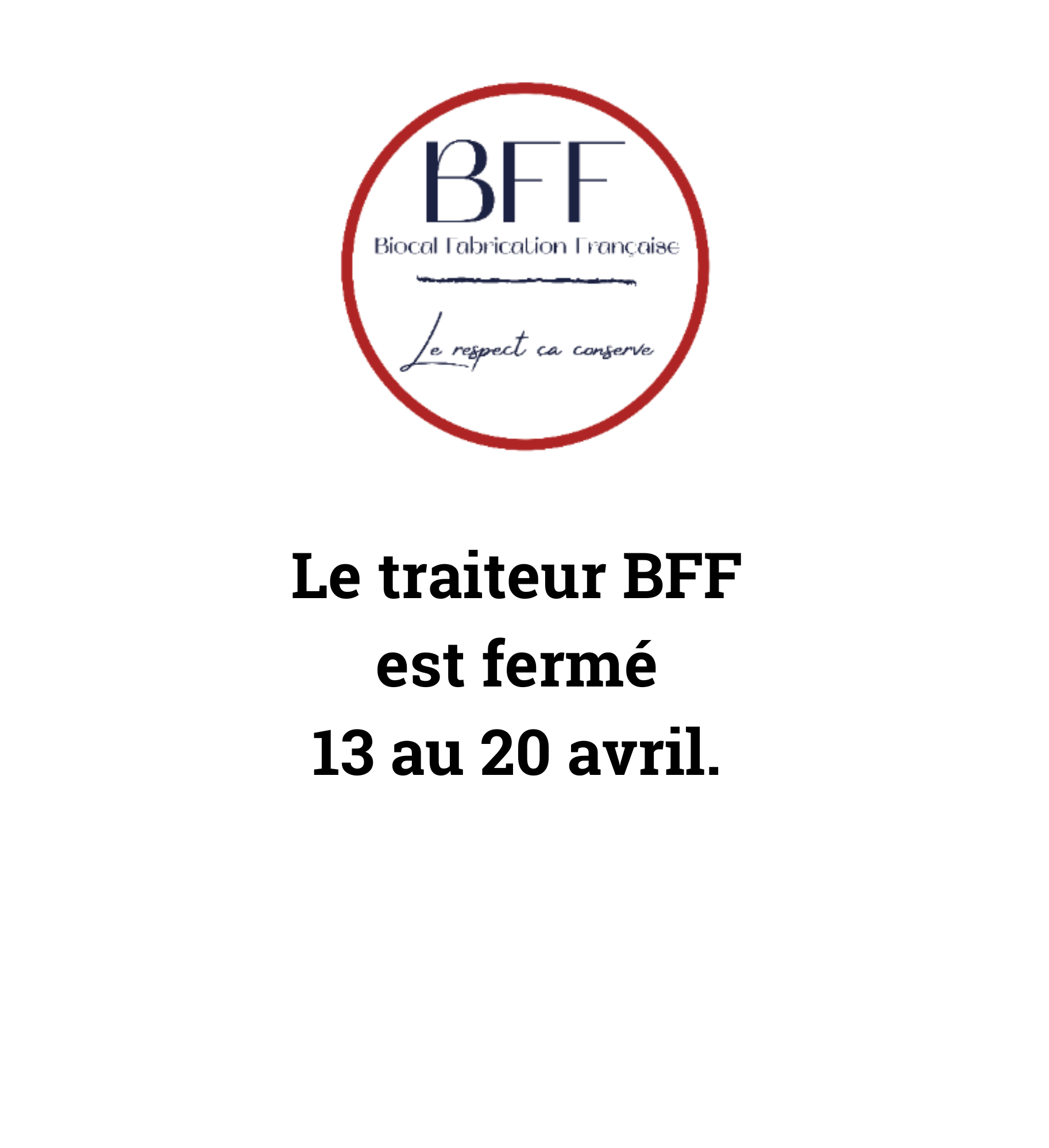 Nous vous proposons des repas en bocaux les jeudis, vendredis et samedis soirs uniquement sur réservation, concoctés par le traiteur vendômois BFF (Biocal Fabrication Française). Son menu change chaque semaine. Nous le mettons en ligne sur notre site chaque mardi soir.